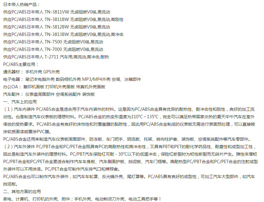 PC/ABS日本帝人TN-3712BW 日本帝人PC/ABS全系列